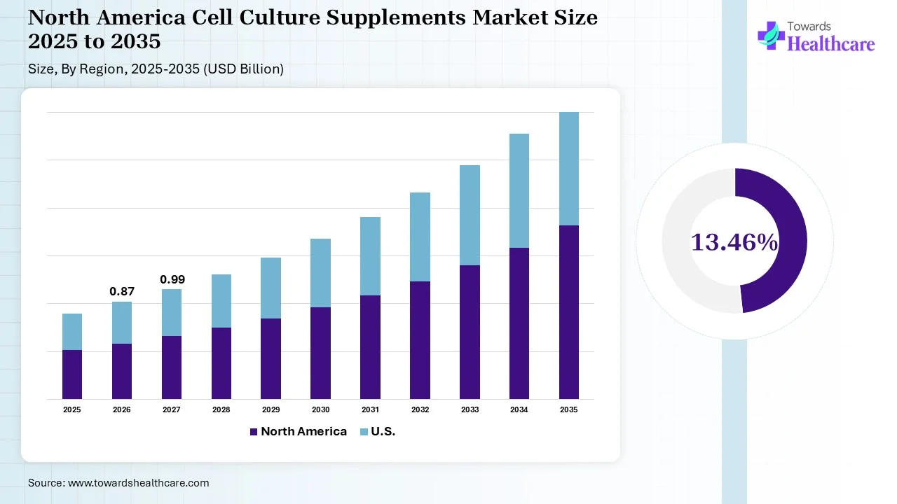 North America led the cell culture supplements market in 2025, due to the rigorous biopharmaceutical manufacturing, breakthroughs in stem cell research, and increased investment & research in regenerative medicine & tailored medicine. Numerous regional firms are stepping towards revolutionizing AI-assisted improvement, 3D microtissue models, and specialized media for CAR-T cell therapy.